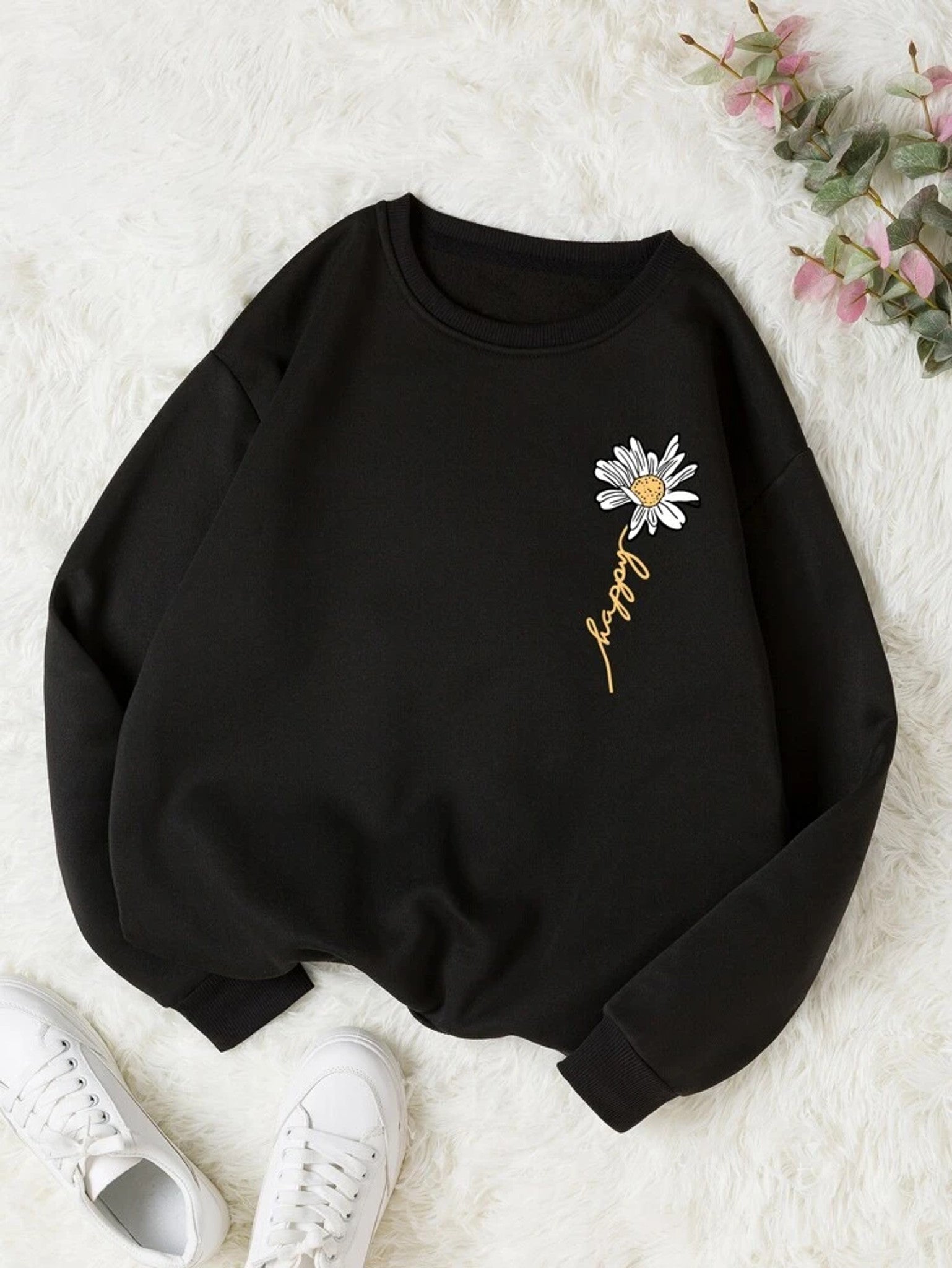 Fifth Avenue DIFT778 Floral Text Printed Sweatshirt - Black