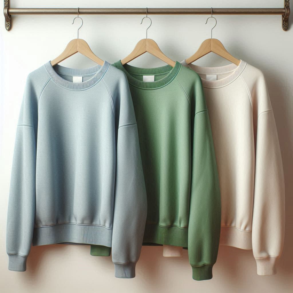 This bundle includes 3 fleece sweatshirtds. In this bundle the 3 sweatshirts are cream, green and light blue.