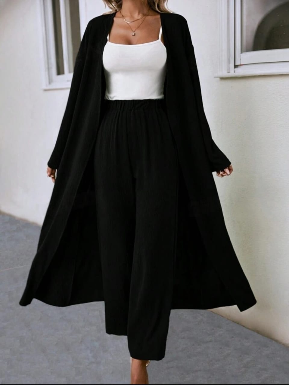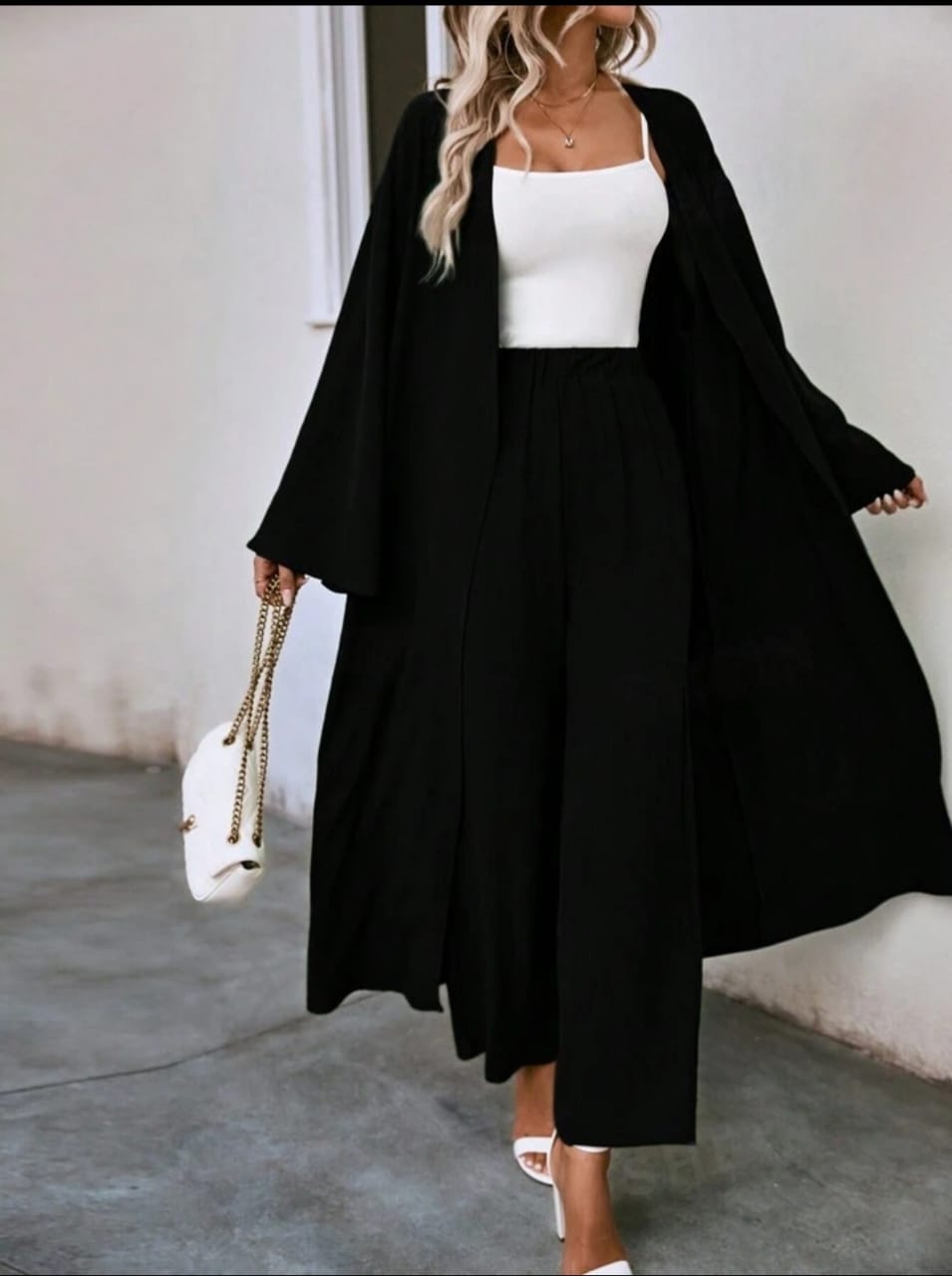This co ord set is made of viscose. It is free size. Pants have an Elastic Waist.
