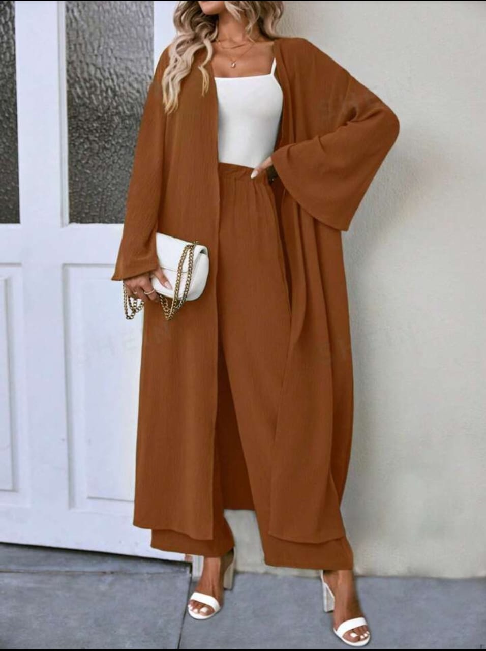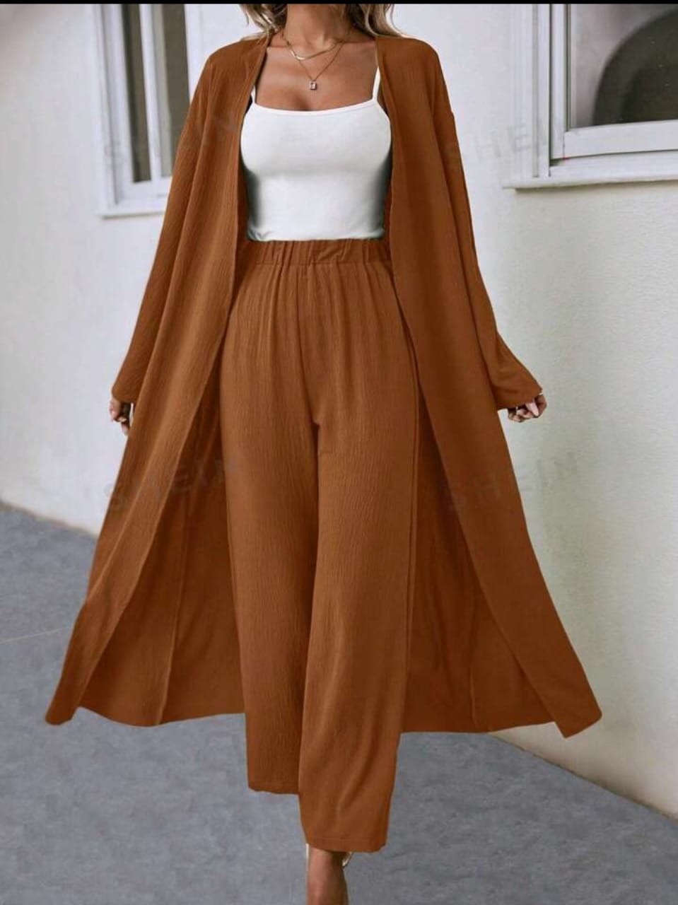 This co ord set is made of viscose. It is free size. Pants have an Elastic Waist.