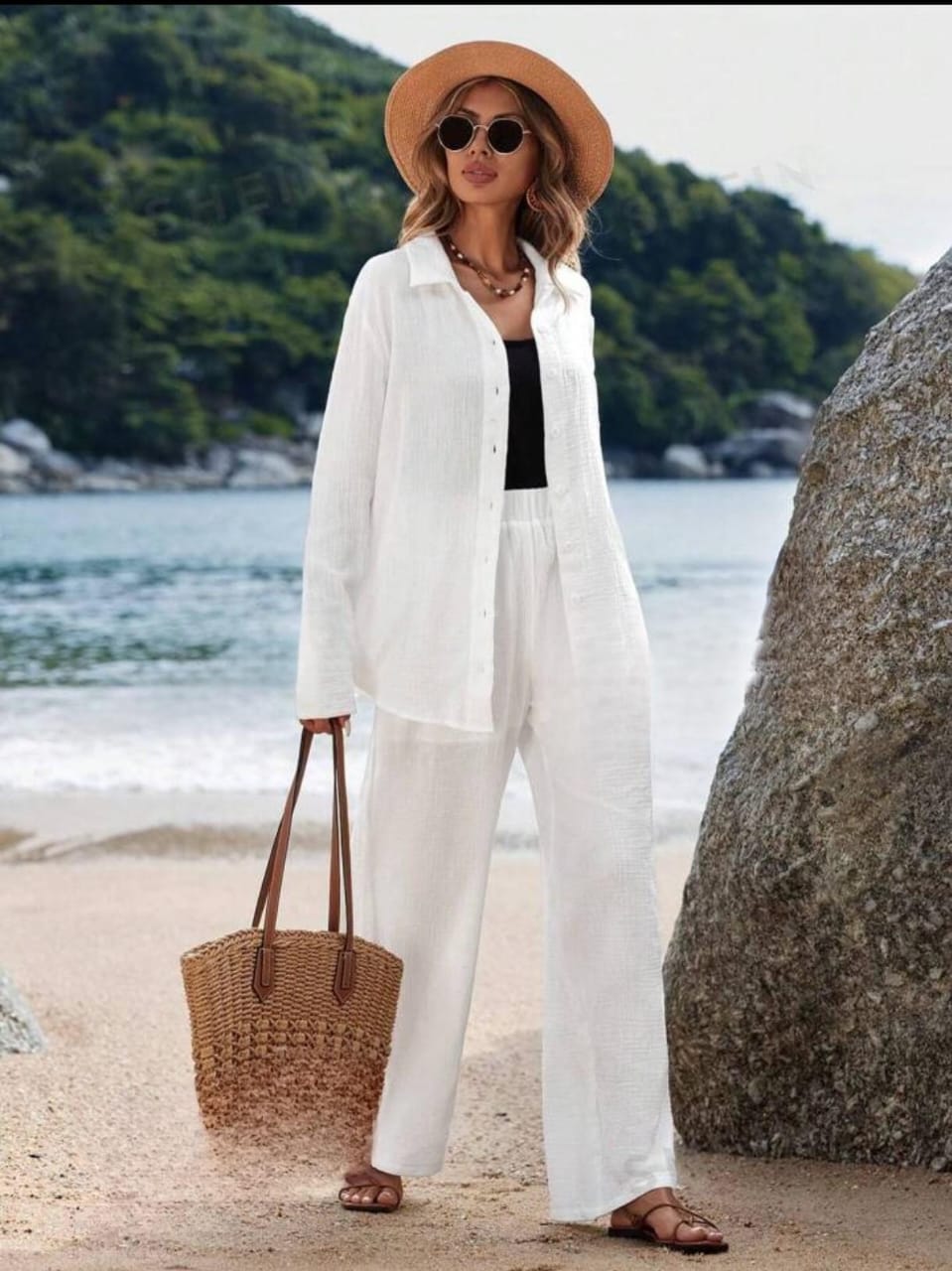 This co ord set is made of viscose. It is free size. Pants have an Elastic Waist.