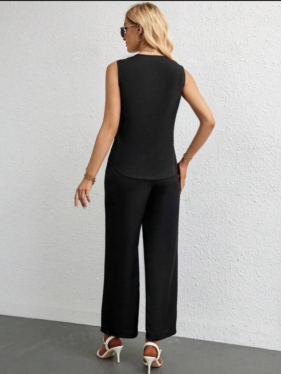 This co ord set is made of viscose. It is free size. Pants have an Elastic Waist.