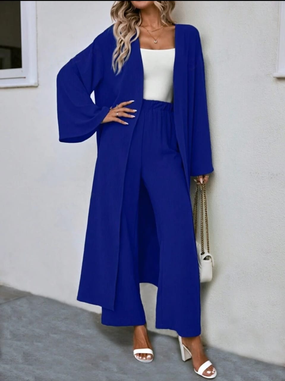 This co ord set is made of viscose. It is free size. Pants have an Elastic Waist.